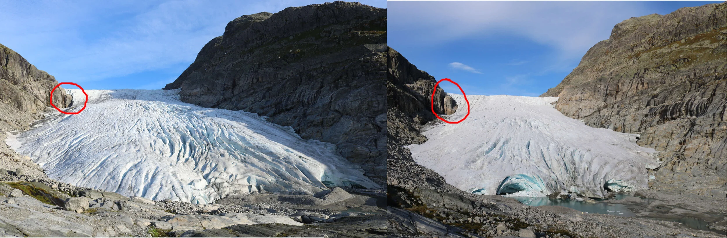 Haugabreen i 2015 og i 2020. Bileta syner korleis meir fjell kjem til syne kring breen, sjå særleg området merka med raude ringar på kvart bilete. I tillegg veks det fram eit lite vatn framfor fronten.