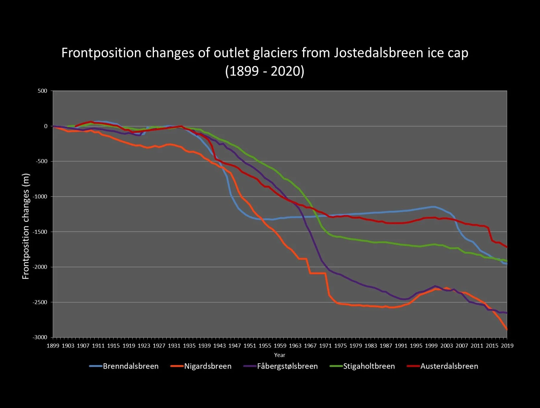 Utviklinga til frontposisjonen på fem utvalde brearmar frå Jostedalsbreen i perioden 1899 - 2020. Nigardsbreen i Jostedalen har, til dømes, trekt seg attende nesten 3 kilometer på ca 120 år.