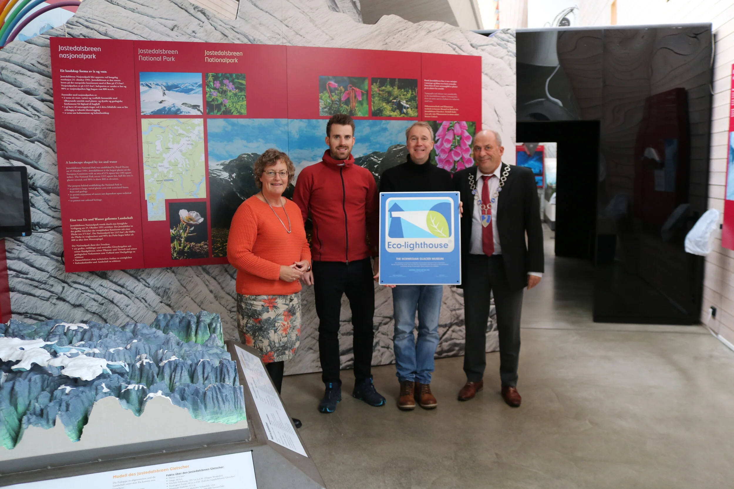 Til stades under overrekkinga var (frå venstre til høgre) Laura Kvamme (varaordførar Sogndal kommune), Pål Gran Kielland (Fagansvarleg og Naturvegleiar Norsk Bremuseum), John Brekke (direktør Norsk Bremuseum) og Jarle Aarvoll (ordførar Sogndal kommune).
